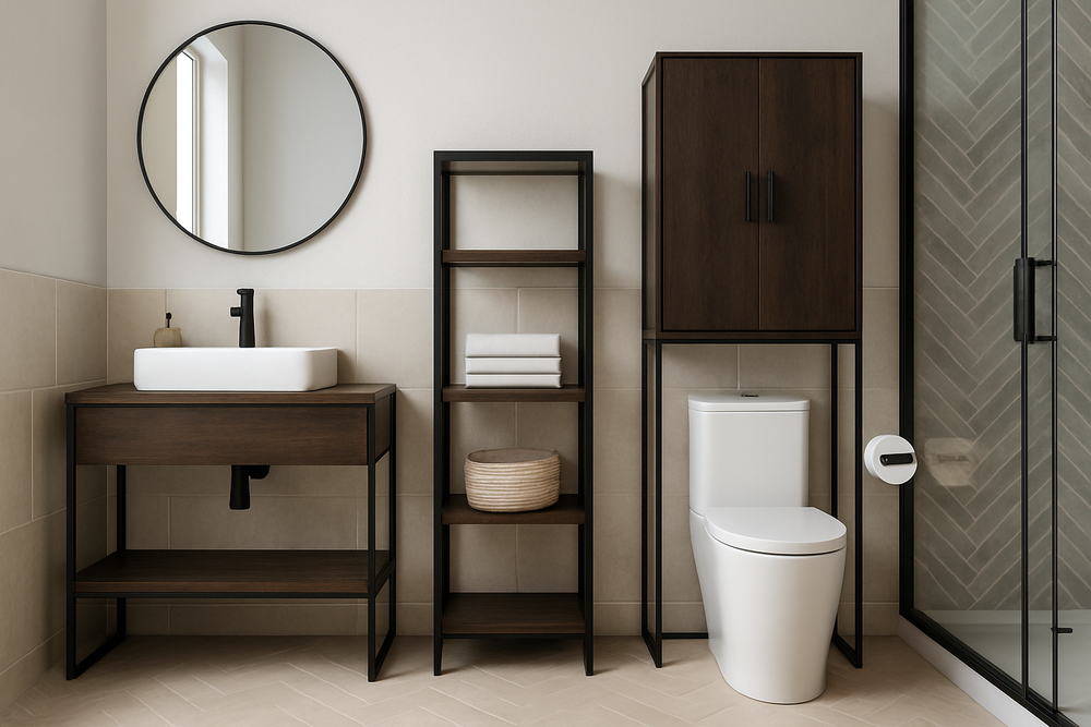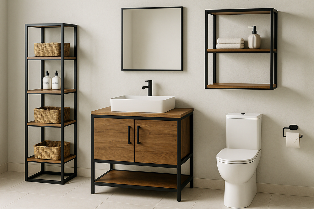 Для зберігання рушників, аксесуарів, декору або кошиків із косметикою. Найпрактичніше - моделі з металевими елементами або полицями з вологостійкої деревини. Вони виглядають легкими та зручними в догляді.